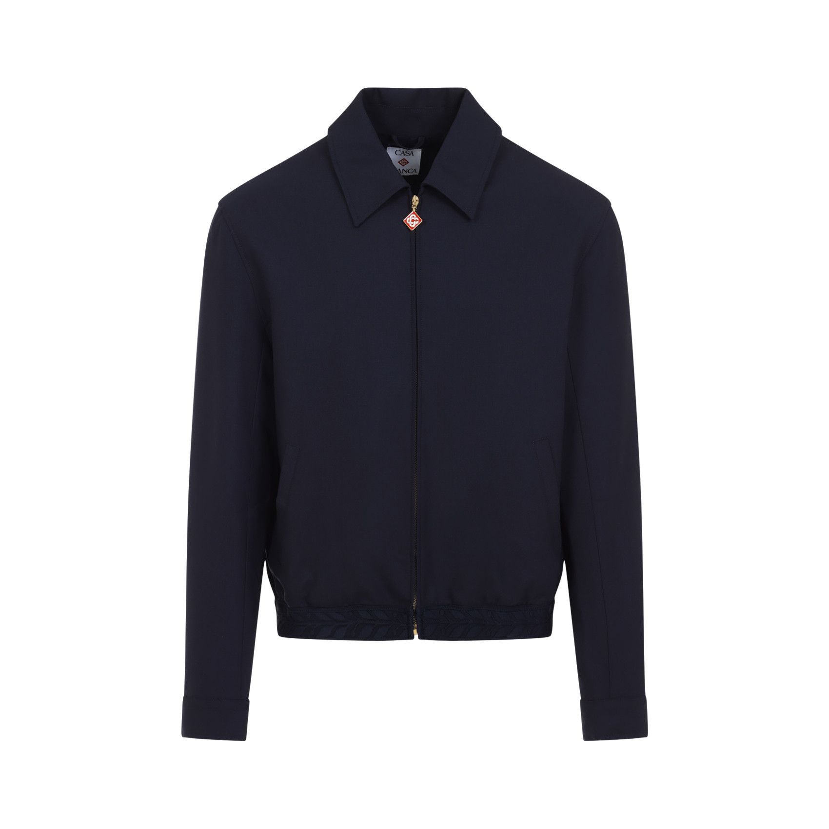 Casablanca Sports Tailored Blue Virgin Wool Jacket. Blue virgin wool, pointed collar, front zip fastening, two front pockets, long sleeves, buttoned cuffs, elastic waistband with signature laurel jacquard pattern, straight hem, lined.