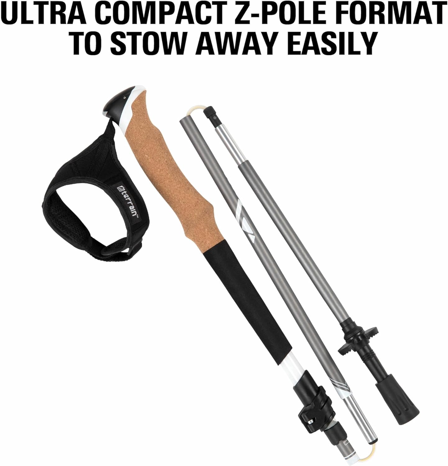 Our commitment to innovation will help push you to the next level, no matter the adventure. We unearth transformative experiences, test our limits, and strive to become one with life outside. Accomplish the unaccomplished and scale unforgiving conditions, traverse tranquil waters, and find your stride. Conquer the Terrain™ beneath your feet. The Terrain™ Alpha Trekking Poles will not only assist you breathing life into uncharted territories but will elevate your game, breathing life into you and the challenges you wish to meet. The compact Z-pole design folds up small and provides an easy to stow-away format for your pack. Aluminum construction is strong but lightweight, while neoprene wrist straps are padded for your comfort during use. A cork upper grip helps streamline your trekking poles for easy packing while maintaining strength to handle any Terrain. Lower grip surface offers users with comfortable and squeezable EVA foam, helping to make hiking easier on your hands. Accommodating weather terrain changes for users, trekking poles come with summer and winter season baskets for all-weather exploration. Poles are designed to fit users 5’1” to 6’5” tall and as a pair weigh, 16.9-ounces. Explore, discover, and conquer the world beneath your feet with Terrain™.
