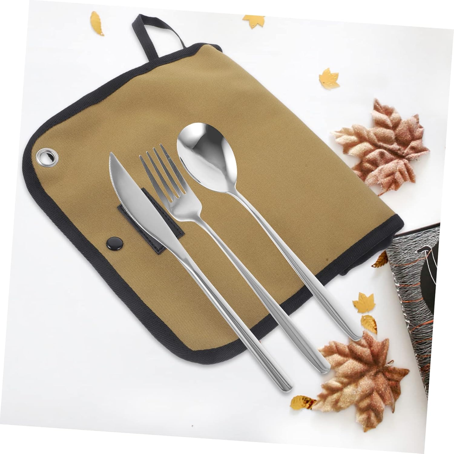 Package Include 1 x Storage Bag 4 x Spoons 4 x Forks 4 x Cutters Characteristics - Size: 21.80X1.90X1.90cm/8.57X0.75X0.75in roll pouch -Material:Stainless Steel, Nylon tableware storage bag - Size: 38.00X24.40X2.00cm/14.93X9.59X0.79in tableware pouch for camping - Color: Clay Color(Bag), Silver(Tableware) tableware set - Size: 20.60X2.40X2.40cm/8.10X0.94X0.94in dinnerware utensils - Size: 20.60X2.40X2.00cm/8.10X0.94X0.79in camping supplies -Allows you to roll it up to a compact package for easy transportation, which will not take up too much space travel tableware set. -This cutlery's edges are polished smoothly, will not hurt your mouth, and reliable to use multi-functional picnic utensils. -You can easily store cutlery, tableware, and many other small items, easy and convenient to use bbq tableware set. -Roll storage, easy to carry, so that you go out more convenient. And you can carry it in your bag camping flatware set. -The cutlery set comes in a roll storage bag, making it compact and easy to carry. for outdoor camping, hiking, picnics, hiking, barbecues, etc portable cutlery set.Goods Descriptiontableware pouch for camping And the travel cutlery is easy to clean, reusable and suitable for everyday use.camping utensils Say goodbye to wasteful plastic cutlery! A helper of outdoor camping, traveling and hiking etc.multifunction tableware pouch Made of , strong and , support long time of use