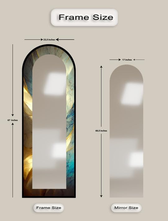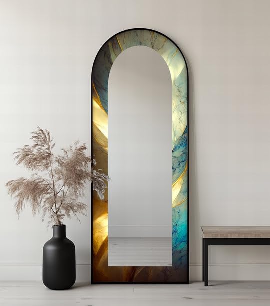 Arch Shaped Floor Mirror with Metal Frame – Gold, Black, or Silver | Leaning, Standing, or Wall-Mounted Full Body Mirror Add artistic charm and functional elegance to your space with our Arch Full Length Mirror, designed to make a bold statement in any room. Whether styled in a bedroom, hallway, or living room, this arched floor mirror enhances your interior with timeless beauty. The edges of the mirror consist of pictures in the colors of your choice printed on tempered glass using the UV printing technique. The mirror itself is mounted on top of this printed tempered glass, giving it a vibrant, durable, and luxurious finish that stands out in any setting. Measurements; TOTAL SIZE (Uv Printed Tempered Glass + Mirror) : 23,5’’W x 67’’ H ONLY MIRROR SIZE : 17’’W x 60,5’’ H Choose from three premium frame finishes—Arch gold mirror, sleek black, or arch floor mirror silver—and enjoy flexible use as a Standing Floor Mirror, Arched Wall Mirror, or casually leaned for a designer look. This is more than a Full Body Floor Mirror with Stand—it’s a piece of functional art. Multiple Placement Methods, This arched floor mirror comes with a U-shaped bracket, which you can freely place in the living room or bedroom. For your convenience in hanging on the wall, special hangers are designed on the back of the mirror.Our premium mirrors are crafted by gluing 4mm tempered glass to a 4mm mirror, combining durability and style. The tempered glass features UV printing for a glossy, vibrant look, while both the glass and mirror have smooth, grinded edges for safety. The hidden metal hanger ensures a sleek, ready-to-hang design, making it an elegant and functional addition to any room.