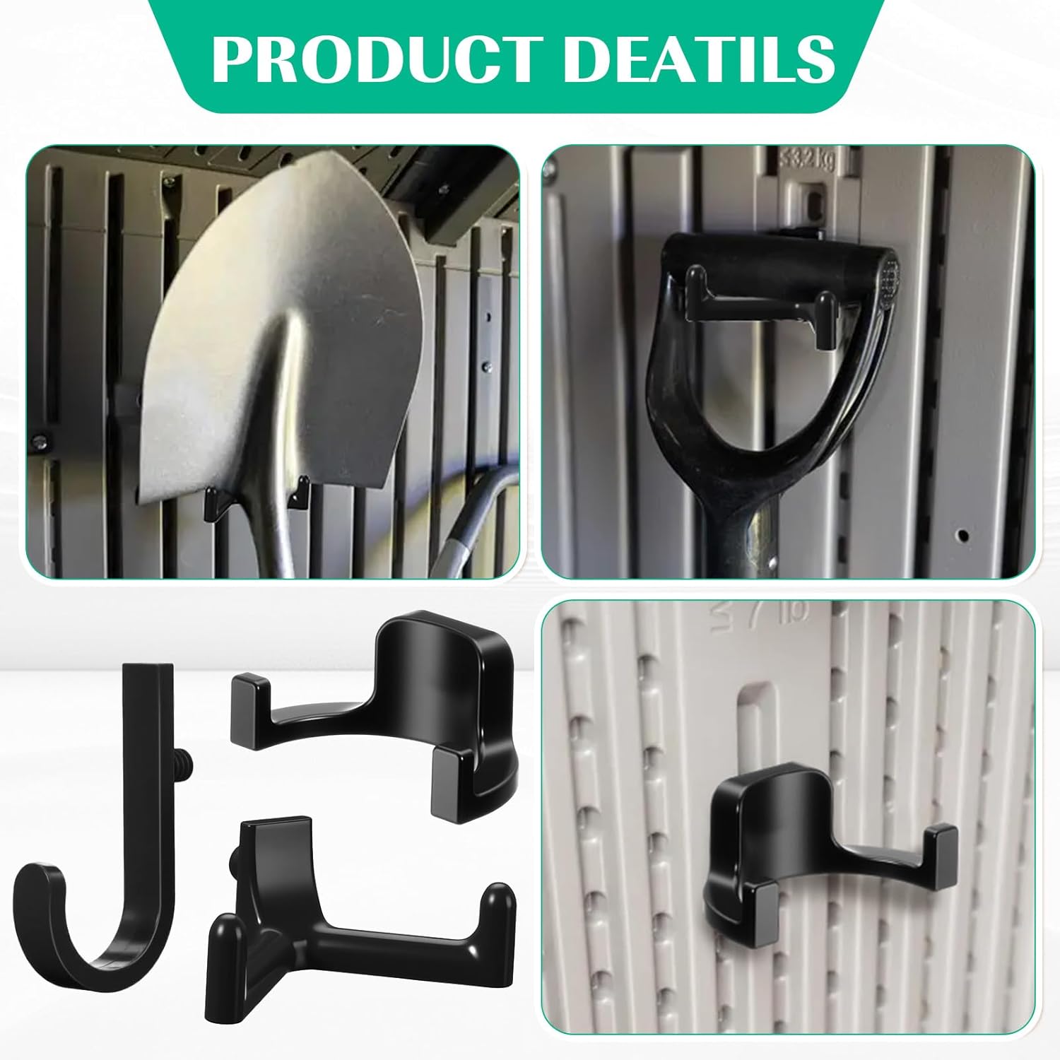 Features: Crafted from quality ABS plastic, these replacement shed hooks are designed to seamlessly restore lost or misplaced hardware. The shed hangers can help you make better use of the space of the plastic shed, which can bring you convenience. They are your essential shed storage and storage accessories. Specifications: Material: ABS plastic Color: black J shaped hook size: about 5.3 x 2.5 inches U shaped hook size: about 4.3 x 2.3 inches V shaped hook size: about 2.36 x 1.77 inches Package includes: 10 x J shaped hooks 10 x U shaped hooks 10 x V shaped hooks Notes: Manual measurement, please allow slight errors on size. The color may exist a slight difference due to different screen displays