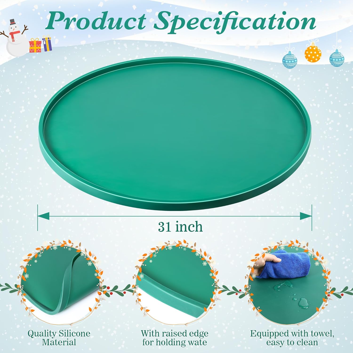 Choose the exquisite silicone Christmas tree mat for a hassle free holiday experience, combining practical protection with easy maintenance and convenient storage. Enjoy a worry free season knowing your floors are protected and your space is organized. Feature and Function: Constructed from robust, quality silicone, it can ensure long-term durability and easy maintenance. Provides ample protection for your wooden floors, shielding them from scratches, spills, and tree debris. Combines both beauty and practicality, offering an ideal solution to protect your wooden floors while adding a touch of festive charm. Specification: Material: Quality silicone materialDiameter: 31 inchColor: GreyWarm tip: Please read the description carefully before purchasePlease contact us if you have any problems