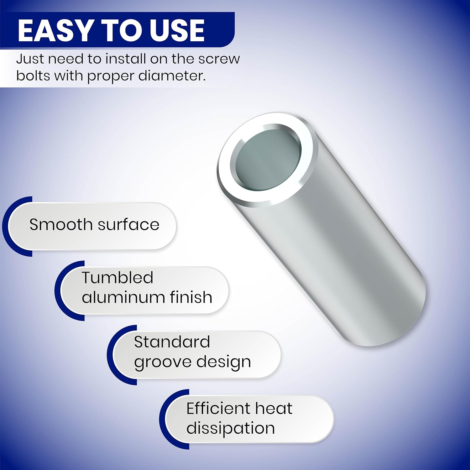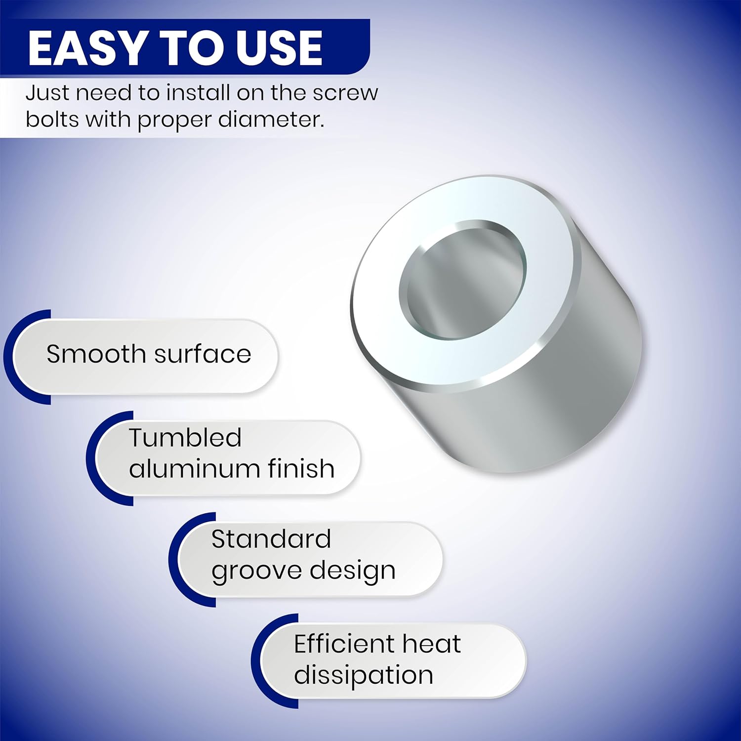 Enhance your projects with this precision-engineered aluminum spacer, crafted for reliability and functionality. Made from T-6061 aluminum, it offers exceptional resistance to corrosion and wear and is suitable for indoor and outdoor use. With a 3/4-inch outer diameter and a 3/8-inch inner diameter, this aluminum spacer ensures compatibility with 3/8-inch or M8 screws and bolts, delivering a secure and stable fit. The unthreaded standoff spacer design allows for easy assembly and disassembly, making it perfect for setups that require regular maintenance or adjustments. This aluminum spacer is versatile and adapts to a variety of applications, including automotive components, industrial machinery, electronics, and more. Whether used as a wall plate spacer, tile spacer, curtain spacer, or VESA spacer, it provides precision and stability to any project. Sold in a Pack of 100 this spacer hardware is designed to meet various project requirements, offering durability and strength. Its polished plain finish enhances the overall aesthetic, ensuring a professional result every time. Ideal for bolt spacers, screw spacers, metal spacers, and aluminum spacer kits, this aluminum unthreaded spacer is available in multiple sizes, including spacer 3/8 aluminum spacer, and 2-inch aluminum spacers, making it a versatile addition to any hardware collection.