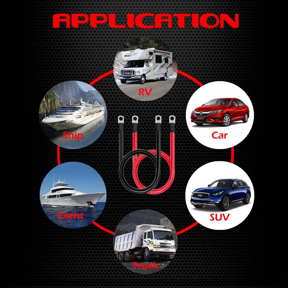 Ampper 20 inch 5 AWG battery cable set with terminals for car, vehicle, RV and more. Specifications: 1, A set 5 gauge wire positive (red) and negative (black) battery cables. 2, 20 inch for every cable. 3, Each cable have 2 pcs M10 (3/8") round center hole terminals (already crimped) on both ends. 4, Fit for 3/8" (M10) stud. 5, Copper cables for maximum power transfer. 6, Nickel plated copper lugs for superior corrosion and oxidation resistance. 7, Premium PVC insulated jacket for the cables. 8, Cable ends are sealed with heat shrink tubing for heat insulation. 9, Used for car, vehicle, RV, solar application, boat and more, also used for electrical equipment. Caution: 1, Removing: remove the nagative (black) cable before the postive (red) cable. 2, Installing: install the postive (red) cable first before the negative (black) cable. 3, Always wear safety glasses when working near batteries. Complete kits includes: 2 x Cables 4 x Lugs