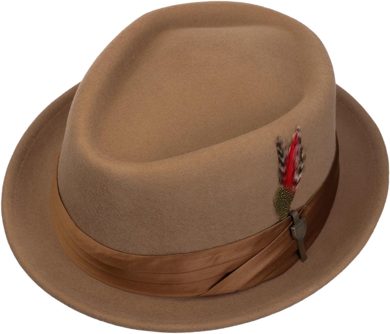 The stout is a short-brim pork pie felt fedora featuring a folded satin band and custom Brixton pin with a metal Brixton ribbed shield.