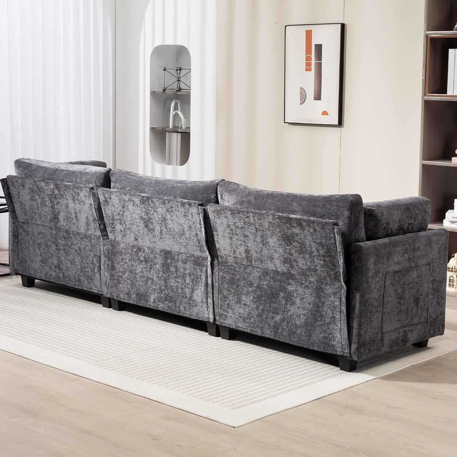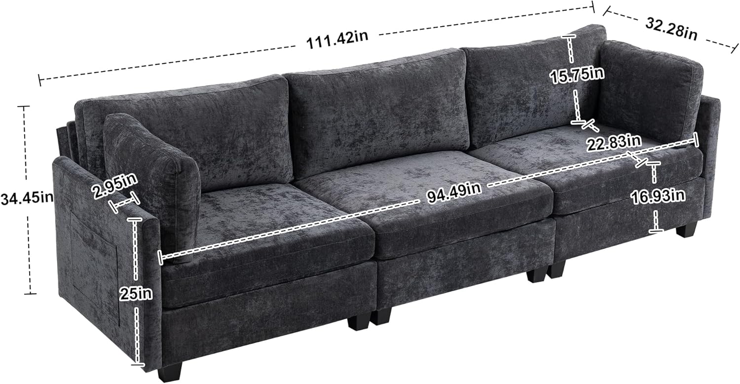 3-seater chenille deep sofa. Cushions/backrests filled with PP cotton & high-resilience sponge (body-conforming, cloud-soft, anti-deformation). Solid wood frame (sturdy, load-bearing), wear-resistant anti-pilling fabric. Has side pocket, rounded corners, high feet. Fits living room/apartment/office.