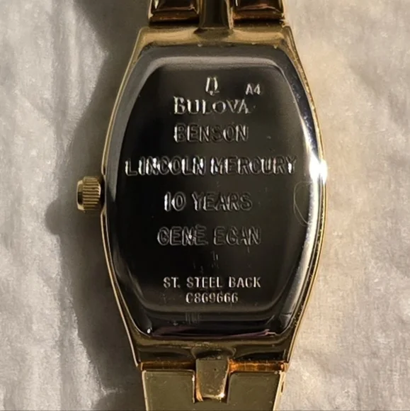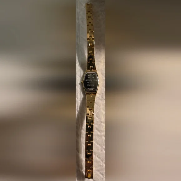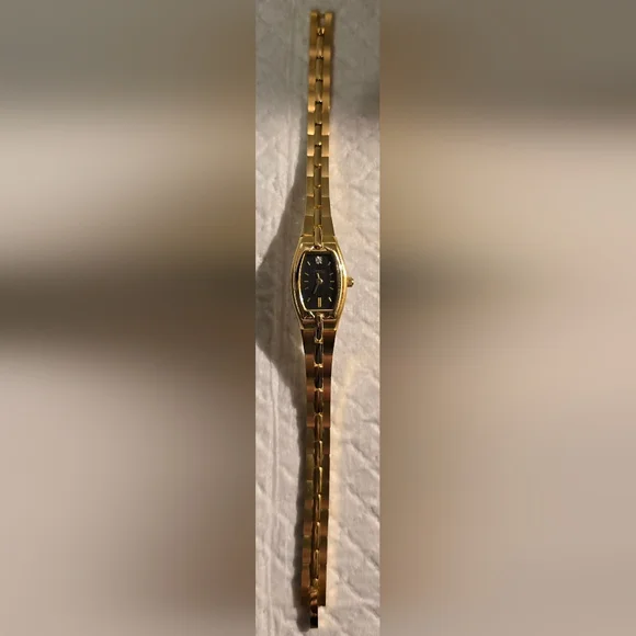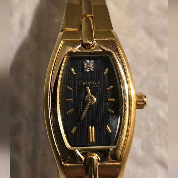 Beautiful Caravelle Ladies Wrist Watch made by Bulova.The watch presents well in original box.Gold tone, it measures approximately 7" long by .50" wide. It sports a black face with gold markings for the hour and hands, and a little diamond sits at 12 o'clock. A new battery shows it keeps excellent time.I honestly think this watch has never been worn; it's in such pristine condition. There are no scratches to the gold. The crystal face is scuff and scratch free as well.