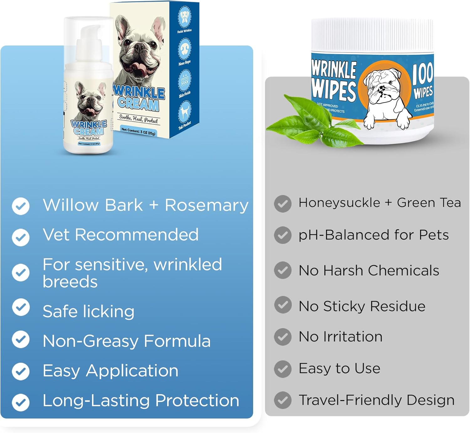 Tired of Stinky Wrinkles? If your Bulldog’s folds smell like yesterday’s chew toy, you’re not alone. Trapped dirt and moisture turn wrinkles into breeding grounds for odor and infections. Meet your new skincare with the Yibesi Dog Face Wipes & Skin Soother Cream Duo, designed to clean, soothe, and protect your pup’s sensitive skin—naturally. Why Pet Parents Love This Combo: Stop Infections Before They Start: Wipes remove debris; cream blocks microbes. No More “Wrinkle Stink”: Honeysuckle neutralizes odor at the source. Hypoallergenic & Lick-Safe: Safe for daily use, even on Frenchies with sensitive skin. Easy Routine: Cleanse daily with wipes, then apply cream for 24/7 protection. Perfect For: Bulldogs with stubborn face folds Pugs prone to tear stains Frenchies with itchy tail pockets Any breed with wrinkles, paw licking, or dry skin