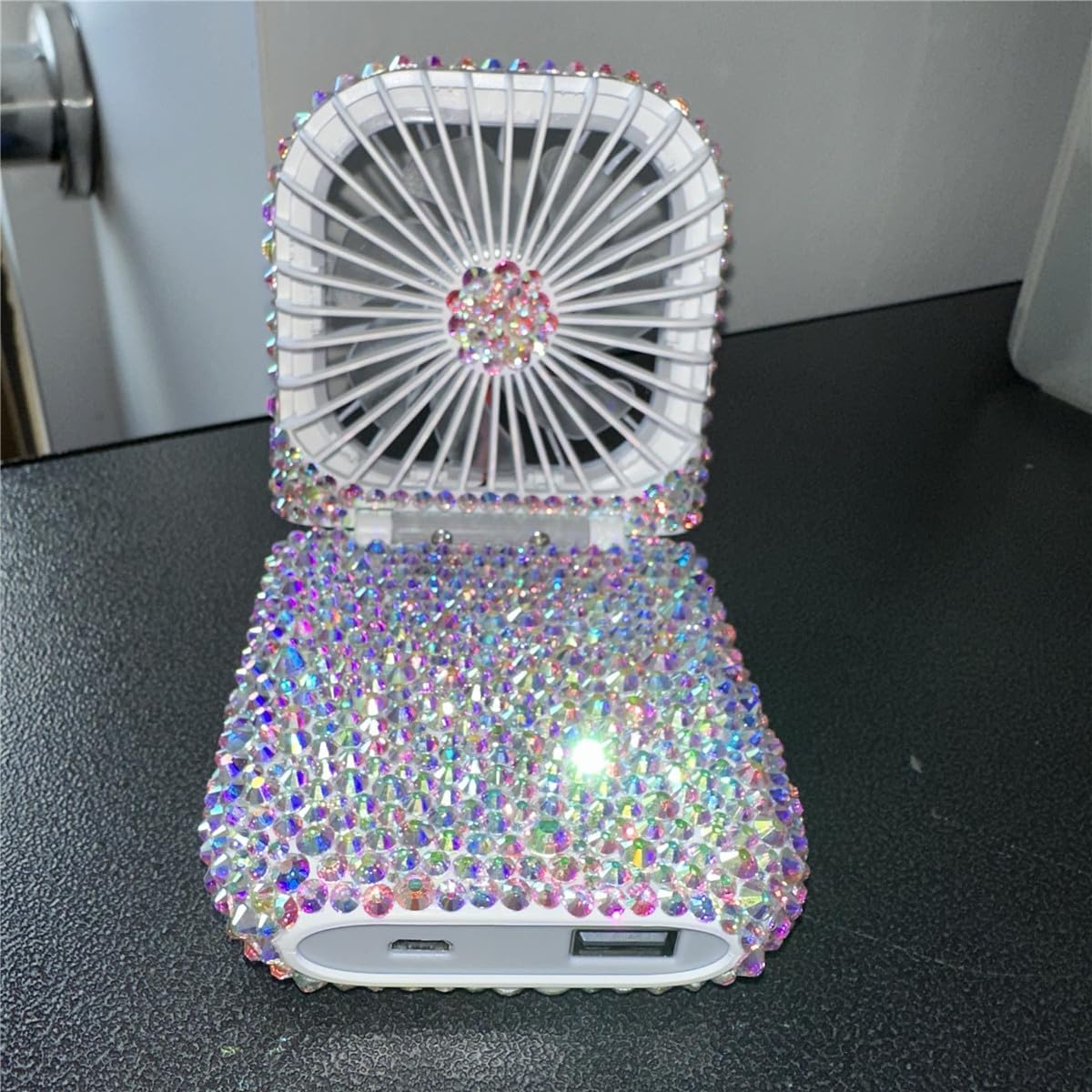 ---Material:the mini fan material is the plastic,surface is glass rhinestone ---Color:White clear ---Power Source:Battery powered,the battery could be used as a power bank,3000ma ---Fan size:14.5*9.5*4.2cm(5.71''*3.74''*1.65'') ---Weight:0.3kg/pc ---Element:not only used as a fan to bring cool,but also used as a power bank when you are outside ---Package:Paper box ---Packaged included:1pc bling fan,1pc charge line,1pc hanging line
