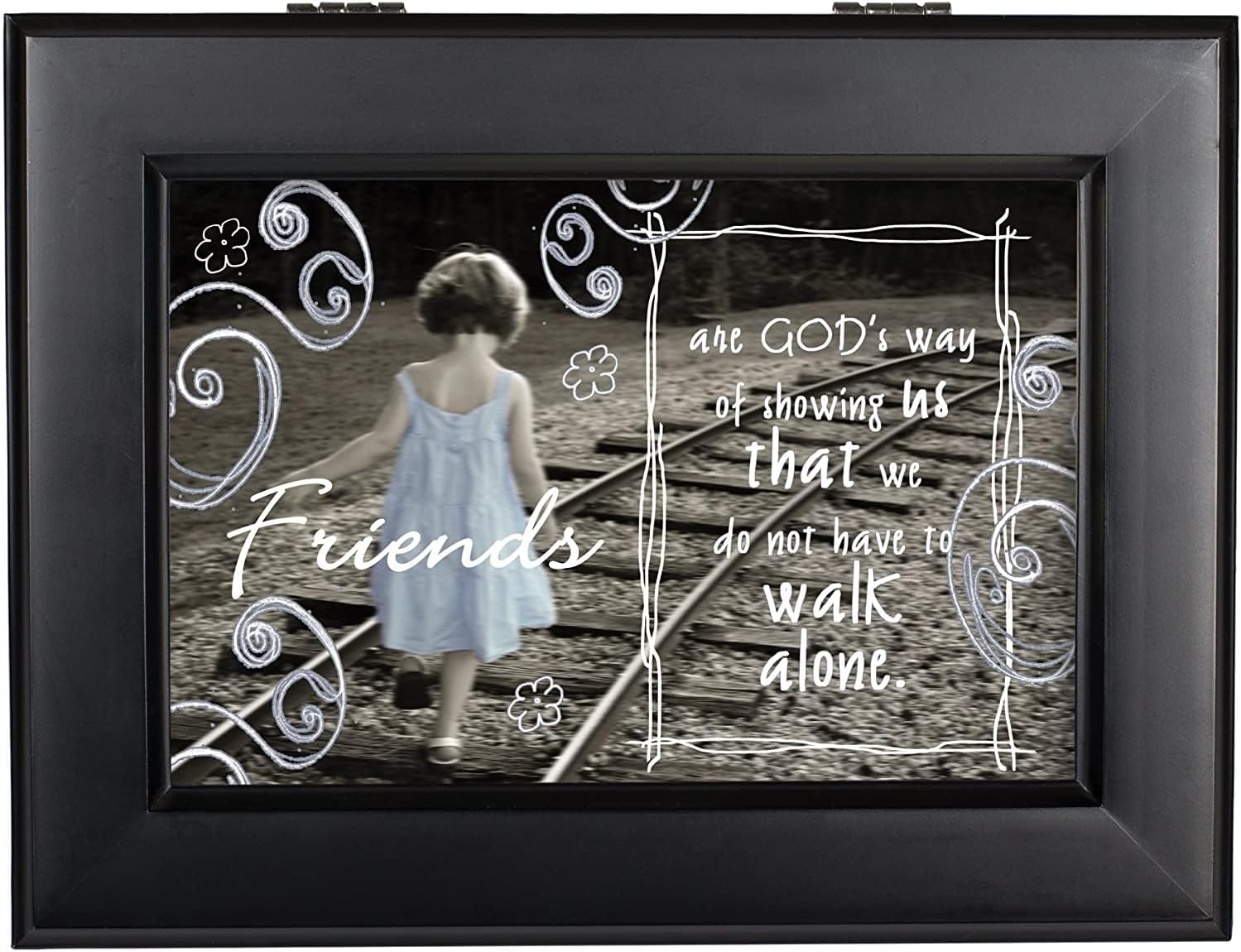 Cottage Garden inspirational and sentimental products are both lovely and classic in style. Be encouraged by a message that reads, "Friends are God's way of showing us that we do not have to walk alone." Designed by artists in the Heartland of America, Cottage Garden’s Collections reach a variety of tastes and have a wide range of occasions for gifting. Dimensional rope trim design gives this home accent classic charm. Matte black finish. Music box measures approximately 8 x 6 x 2.5 inches; Replace artwork with a 4 x 6 inch personal photo. Traditional wind-up mechanism engages music to play melodic tune That's What Friends Are For. Black velvet lined interior cushions your precious treasures; Decorative bun feet are padded to protect table top and shelf surfaces. Ships in protective packaging; Ready for giving to that special someone.