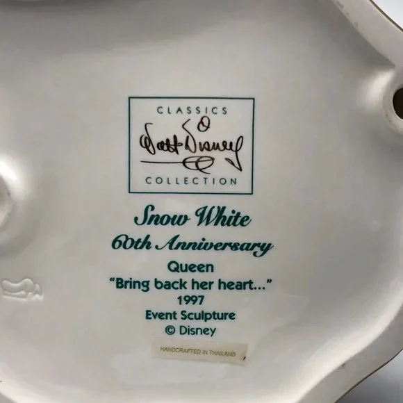 Disney Snow White Evil Queen "Bring Back Her Heart" From Snow White and the Seven Dwarfs Measures approximately 8.5" tall.Walt Disney Classics Collection shows they have 1 "new" available at $350.00. Closed Edition Sept. 1997.From the Snow White Series. This figurine is made of porcelain and is marked on the bottom, signifying the year it was produced. The "Sailor's Hat" represents 1996.Gently displayed, excellent condition.
