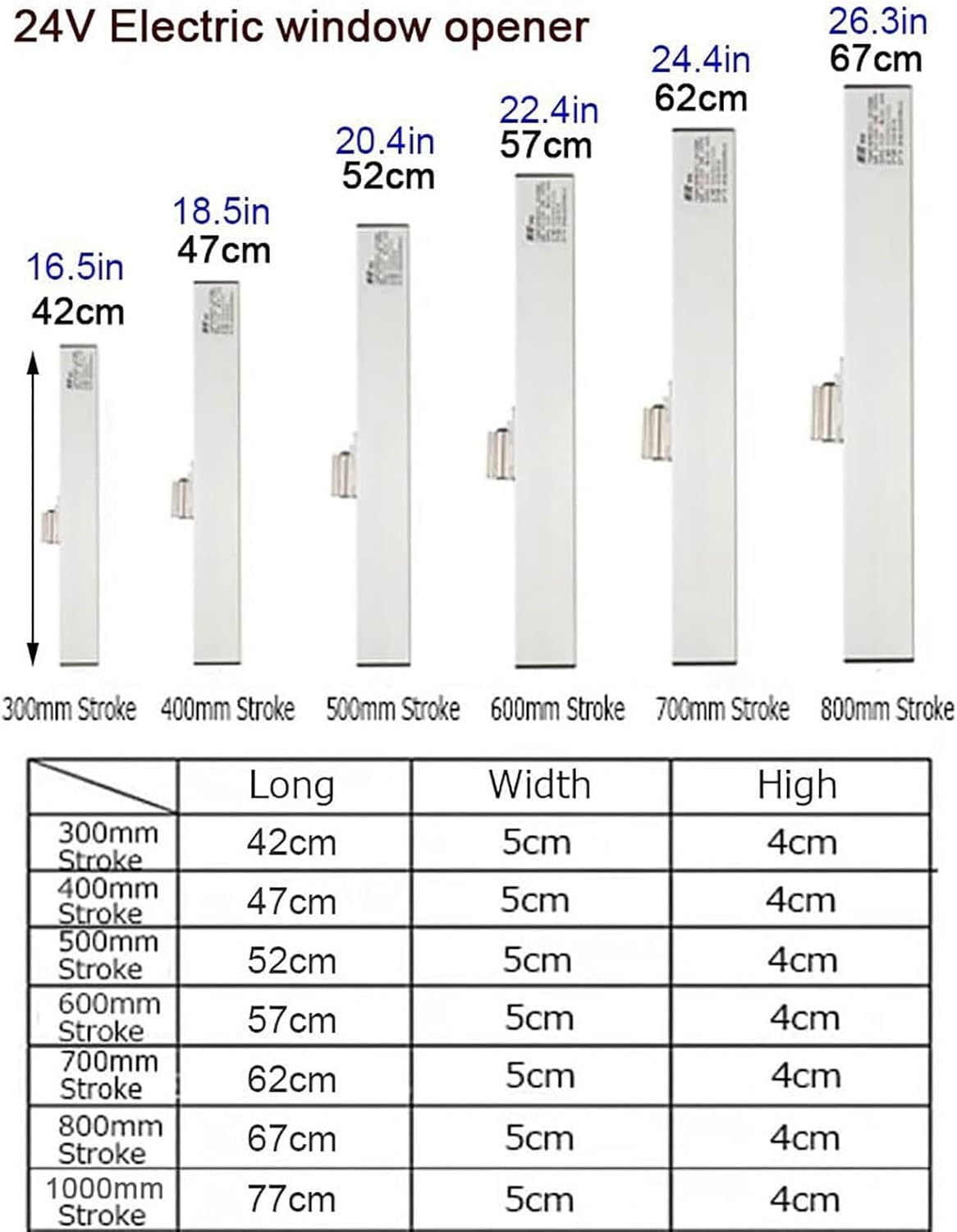 Name: Chain electric window opener.Rated voltage: DC24VProduct stroke: 300/400/500/600/700/800/1000MM (optional)Scope of application: aluminum alloy, plastic steel doors and windows.Applicable window width: 0.47m-1.5mSpeed: 10mm/sProtection level: IP32Product torque: 600NOverload protection: 1.2AOperation mode:1. Manual operation.2. Wireless remote control or control key.Packing list:Electric chain window openerInstallation accessoriesRemote controlWall switch controller