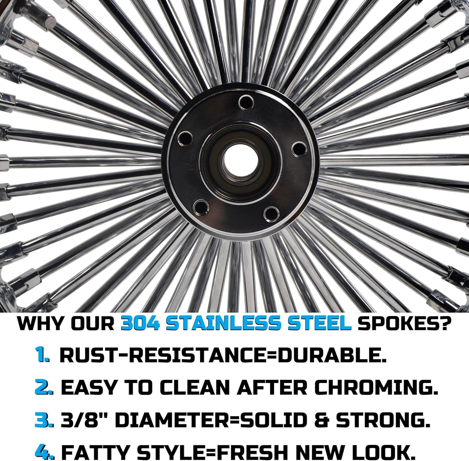UPGRADE YOUR HARLEY WITH A LEGENDARY FAT SPOKE WHEEL. Give your 2008-up Dyna, Softail, Sporster or 2008 Touring bike a head-turning look with this 16"x3.5" rear wheel. Designed to match OEM pulley, and sprocket. WHY CHOOSE THIS WHEEL? 1. Perfect Fitment: Compatible with stock pulley and sprocket. 2. Dual Bearing Support: Sealed with 25mm non-abs bearing with inner spacer for seamless adaptation to axles. 3. Proven Durability: Stainless steel spokes and chrome-plated rims withstand years of riding. FITMENT: The Sportster's rear brake rotor, pulley, and sprocket are mounted in reverse compared to other Harley models. Please note. Note: Verify axle size before purchase. For Touring models, only for 2008 models. Not for Touring 2009-up models. For 2008 Touring Road King, Ultra, Road Glide, Electra Glide, Street Glide and Dressers For 2008-up Softail Heritage FLST, Fatboy, FLSTC Classic, FLSTN Deluxe, Night Train For 2008-up Dyna FXDWG, For 2008-Up Sportster & Narrow Glide CAUTION: For rear wheel applications only. Respacering may be required for certain axle configurations. WHAT’S IN THE BOX? 1-16"x3.5" Chrome Rear Wheel (52 spokes) Installed 25mm Bearing & Inner Spacer Built-in Valve Stems (Tubeless Ready)