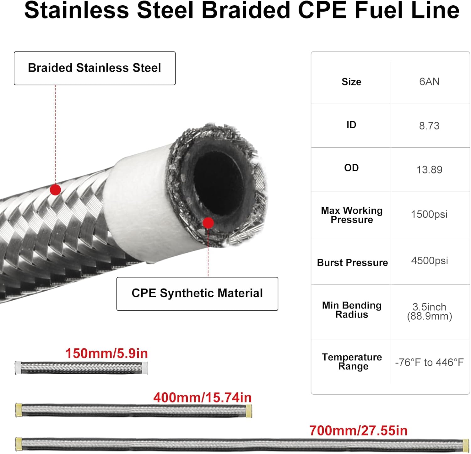 • [Components] Fuel regulator includes 1pc fuel pressure regulator, 1pc pressure gauge, 1pc fuel rail adapter, 1pc AN6 port plug, 1pc bracket, 3pcs AN6 straight fittings, 3pcs AN6 90 degree fittings, 3pcs 6AN Stainless Steel Braided CPE fuel line(5.9in/15.74in/27.55in)