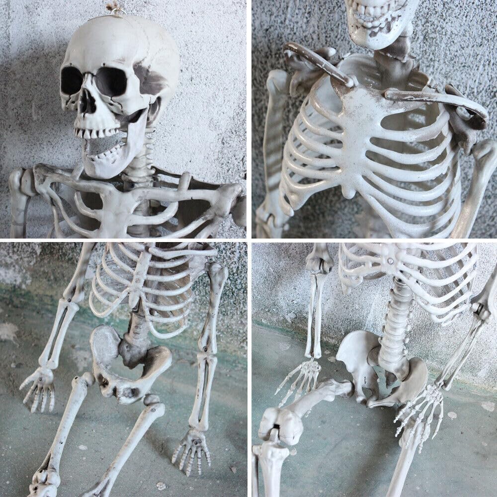 halloween full body skeleton is made of durable plastic, 170cm adult skeleton with moving joints. the skeleton head, middle body part and lower body part coming apart, but it is very easy to assemble it. please insert neck to spine, insert lower spine part to up spine part, then finish assembly. halloween skeleton can scare your neighbors, family and fellow trick-or-treaters, it is the perfect decor for haunted houses and halloween parties. life size plastic skeleton props with movable head, jaw, the joint is posable. easily place body parts to display various poses and positions. the realistic skeleton is great for indoor or outdoor decor, projects, pranks and more. halloween posable skeleton - 170cm realistic life size human skeleton bones with movable joints for halloween haunted house decoration