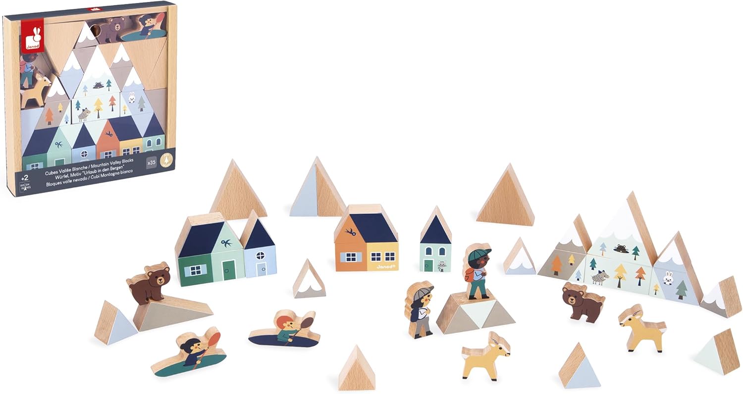 Build the mountain of your dreams! With this wooden building set, take your 2-year-old to the heart of the snowy mountains. Composed of 34 elements, this set includes 26 cubes to create an alpine village and 8 characters and animals. With these solid wood blocks, children can develop their fine motor skills and creativity while having fun stacking, assembling and inventing stories. Little ones will love seeing their world come to life, while older ones can imagine fantastic adventures in a winter landscape. The ingenious placement of the cubes is printed on the bottom of the box, so all you have to do is model them to place it all like a puzzle, with a guaranteed "wow" effect upon opening the set. Part of the Cross-Roads collection and is ideal for use with the Vallée Blanche play mat or others in the range. Made of FSC wood, it is environmentally friendly. The perfect educational game for hours of fun and discovery.