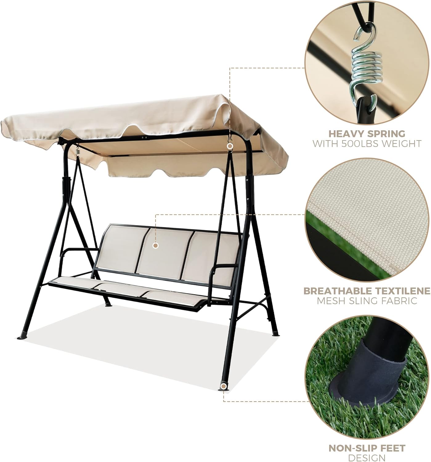 Porch Swings, 3-Seater Outdoor Adjustable Canopy Porch Swing Chair for Patio, Garden, Poolside, Balcony w/Armrests, Textilene Fabric, Steel Frame