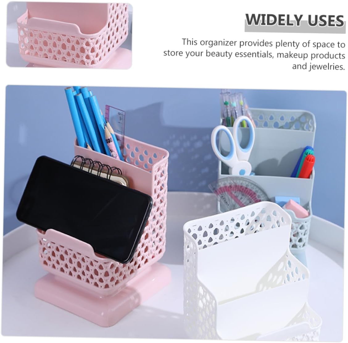 Package Include 3 x Desk Organizers Characteristics -Size: 16.00X11.50X11.50cm/6.29X4.52X4.52in plastic makeup organizer -Color: Pink makeup organizer -Material: Plastic make up organiser storage - Featuring a sleek and compact design, this makeup organizer will not take up too much space makeup drawer organiser. - Keep your favorite jewelries, cosmetics, , and small accessories at your cosmetics organizer. - Easy to organize small or crowded bathroom spaces and keep clutter . Bring more convenient for daily life plastic stationery organizer. - A that you should buy for your friends, families or lovers for Valentine's Days, Birthday, Mothers' day, Christmas' day or Wedding stationery organizer. - A storage organizer for makeup, beauty tools, grooming utensils, stationery, jewelries, etc makeup countertop organizer.Goods Descriptioncosmetics organizer Create design, perfect for making the of your space.desktop organizer stationery Your makeup supplies and jewelry will be organized, keeping your vanity or bathroom counter neat and tidy.perfume organizer This desk organizer can be uses to store tweezers, lipstick, lip pencils, lip liner, eye shadows, eye liner, lip balm, makeup brush, etc