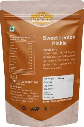 Sweet Lemon Pickle, 200g, Mango Pickle. Ingredients: Lemon, Sugar, Red Chilli Powder, Mustard Dal, Corn Oil Fenugreek Dal, Turmeric, Salt, Cumin, Other Spices, Citric Acid(E330) & Preservative (E211).