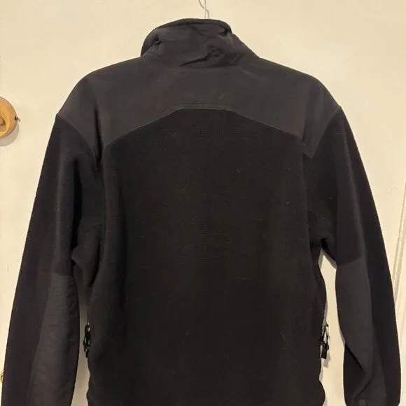 Classic (90s era) TNF black fleece performance jacket that can be worn alone or zipped into an outer shell or jacket to add warmth. Nylon reinforcing on the shoulders, neck and lower arms, and bottom draw cord. This is sized Medium, but not sure if M's or W's or Unisex - Worn by W size 10 and zipped into a M's Small outer jacket (also available - ask for pricing together!) which worked perfectly. Gently used, like new condition. Great simple fleece jacket that has loads of life left!
