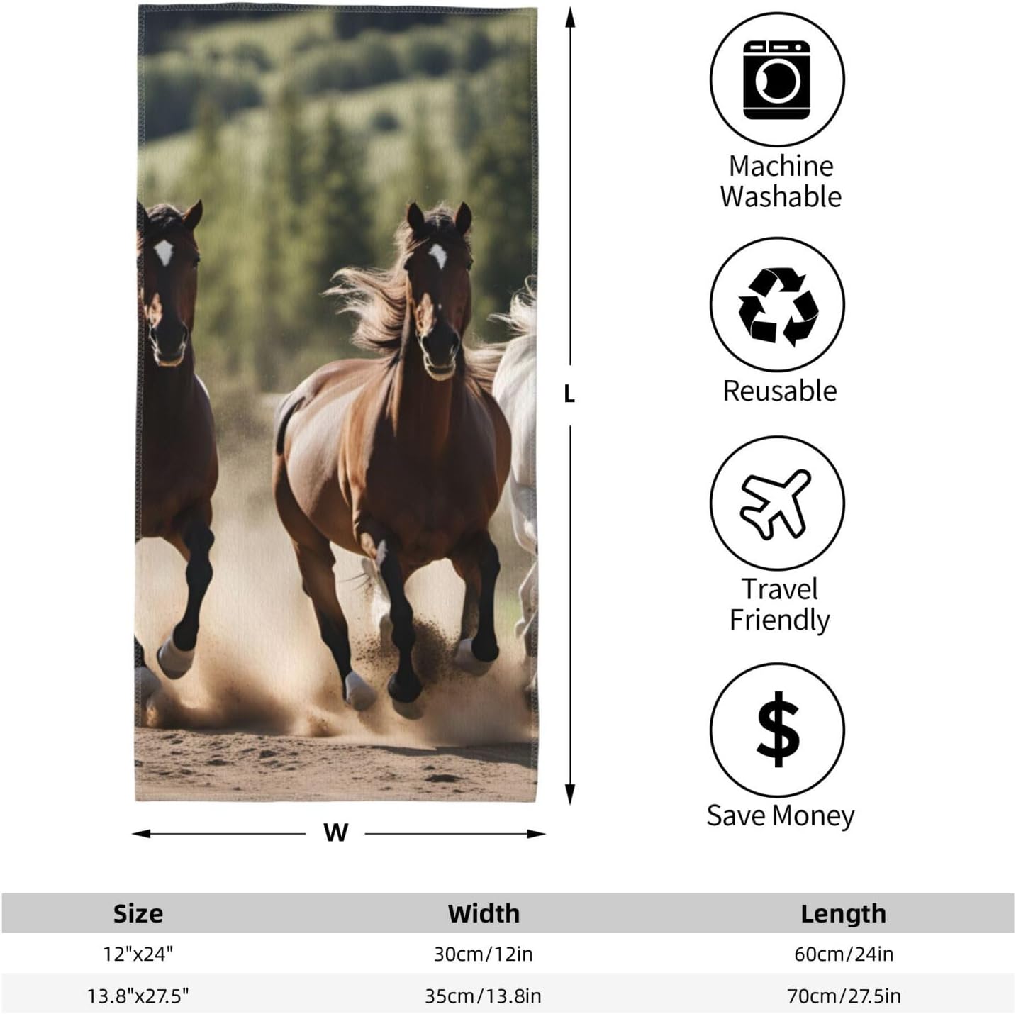 Crafted from premium polyester, the Three running horses print Bath towels offer an indulgent touch, with their plush and gentle texture embracing your skin as you dry off after a long day. The high-quality material ensures excellent water absorption, making them highly practical for everyday use. Their fade-resistant nature means the colors remain vibrant even after multiple washes. With two size options, 12*24 inches and 13.8*27.5 inches, these Three running horses print Bath towels can accommodate various preferences. The breathable fabric allows air to circulate, preventing that stuffy feeling and providing a refreshing experience.