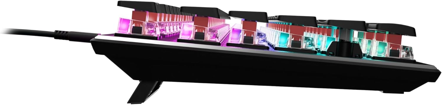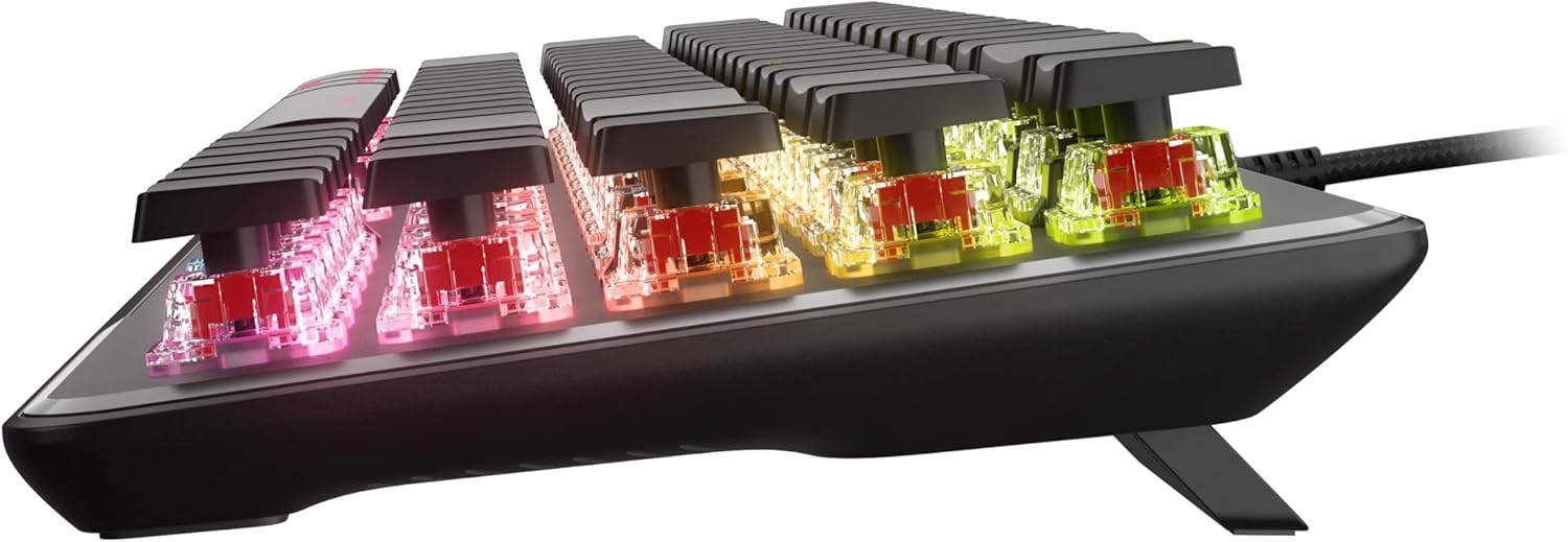 The Vulcan II builds on the success of the award-winning Vulcan series while setting a new standard in gaming performance with TITAN II mechanical switches. TITAN II mechanical switches have been optimized with transparent housing for an immersive lighting experience, pre-lubed stabilizers for smooth & stable keystrokes, an extended durability of more than 100M keystrokes, and cross stems for 3rd party keycap compatibility to customize your look. TITAN II RED switches have a smooth linear feel with minimal resistance making them ideal for competitive gaming. For an added functional advantage, enter game mode to access Easy-Shift[+] function layer technology and unlock a second layer which can be programmed into near limitless options. The Vulcan II features a full set of dedicated media keys and push to mute volume knob providing full media control at your fingertips without interrupting your game. Additionally, Full n-key rollover and anti-ghosting ensures that every single key stroke and combination of keys always registers as intended. The Vulcan II retains unique iconic elements like low-profile key caps, detachable palm rest, durable aluminum backplate and AIMO lighting technology which produces vibrant RGB lighting effects right out of the box and can sync with other compatible AIMO-enabled products. Save up to 5 profiles of custom lighting, key reassignment and more, directly on your keyboard.TITAN II MECHANICAL SWITCHES TITAN II RED switches have a smooth linear feel with minimal resistance making them ideal for competitive gaming. TITAN II switches have optimized transparent housing for a better lighting experience and tested durability of 100M keystrokes.SMOOTH & STABLE KEYSTROKESPre-lubed key stabilizers on all mechanical keys reduce noise & improve the feel with a smooth and stable keystroke.EASY-SHIFT[+]Enter game mode to access Easy-Shift [+] button duplicator technology and unlock a second function layer which can be programmed into near limitless options.DETACHABLE PALM REST The detachable palm rest provides support for long gaming sessions.DEDICATED MEDIA CONTROLSWith a full set of media keys and push to mute volume knob, experience full media control at your fingertips without interrupting your game.ALUMINUM TOP PLATE Anodized aluminum plate reinforces its structural integrity and protects against wear and tear.AIMO ILLUMINATION AIMO lighting technology produces vibrant RGB lighting effects right out of the box and can sync with other compatible AIMO-enabled products.KEYCAP CUSTOMIZABLE The TITAN II switches are compatible with many third party cross shaped mount keycaps to customize your look.ON BOARD PROFILES Save up to 5 profiles of custom lighting, key reassignment and more, directly on your keyboard. ANTI-GHOSTING & NKRO Full n-key rollover and anti-ghosting ensures that every single key stroke and combination of keys always registers as intended.