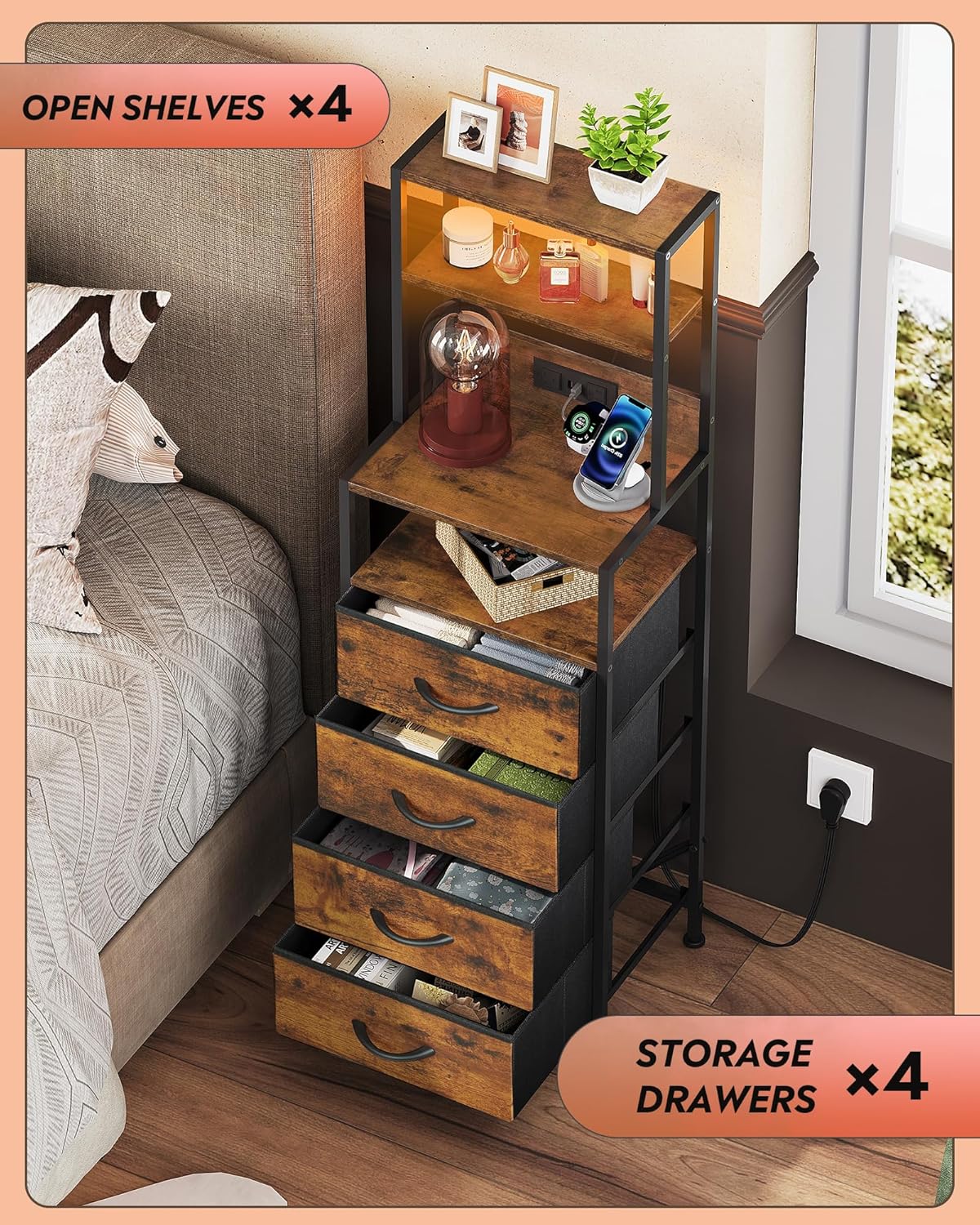WLIVE Tall Nightstand with Charging Station, LED Night Stand with 3 Fabric Drawers and Storage Open Shelves, Bedroom Nightstand table, Bed Side Table for Living Room, Black