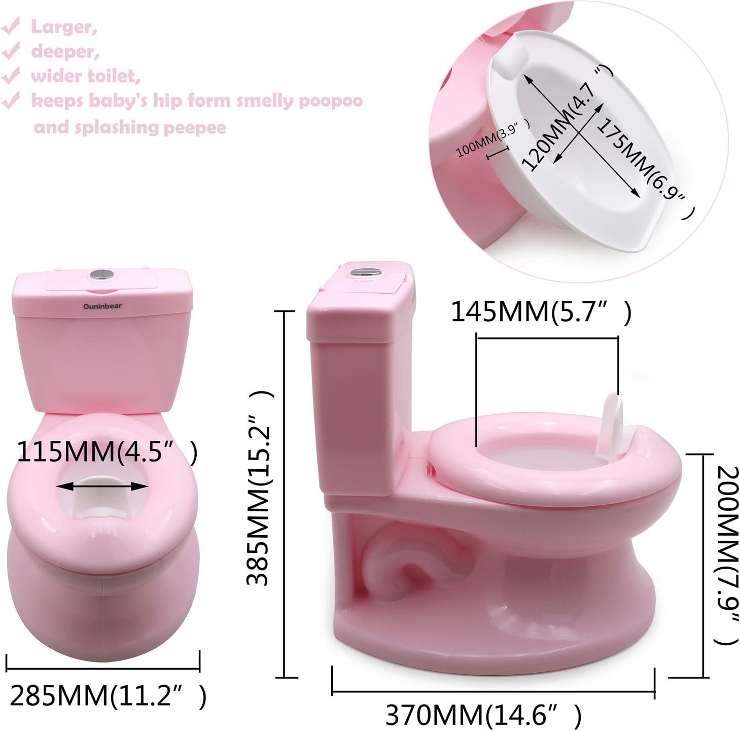 Feature:Adorable animal shape, attracts baby to develop a good habit of going to the toilet.Non-toxic,eco-friendly and harmless plastic materialErgonomic high back design, prevents baby from falling backwards and protects baby's spine.4 enlarged antislip pads on the bottom, avoid rolling and shaking.Larger, deeper, wider toilet, keeps baby form smelly poopoo and splashing peepee.Detachable design, smooth inner wall, easy to clean.Multiple functions, can act as both a toilet and a little stool.